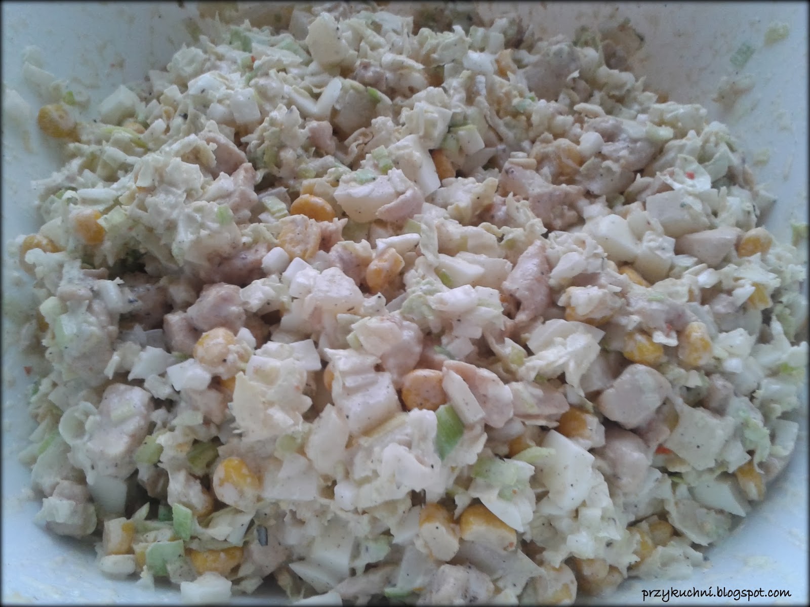 Kapustę pekińską, por, ananasa i jajka kroimy na małe kawałki.